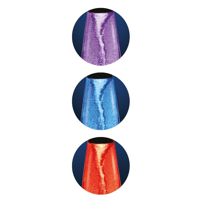 Po włączeniu lampy woda z brokatem zaczyna się obracać i tworzy efekt tornada. Woda jest podświetlona diodami LED, które płynnie zmieniają kolory.