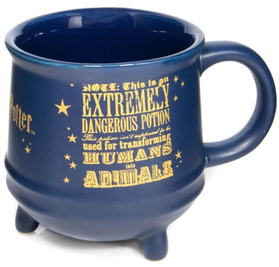 Ciemnogranatowy dekoracyjny ceramiczny kubek w kształcie kotła z napisami Ekstremalnie niebezpiecznych mikstur (Extremely dangerous potions) z Harry'ego Pottera. Kubek jest odpowiedni dla wszystkich czarodziejów, którzy chcą sobie zrobić kakao lub inny eliksir.