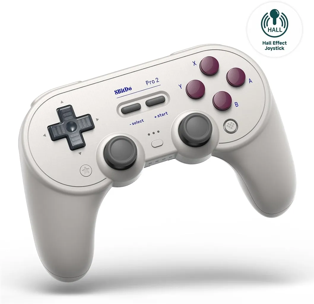 Gamepad 8BitDo Pro 2 Bluetooth. Graj jak profesjonalista z najbardziej zaawansowanym kontrolerem retro 8BitDo, teraz wzbogaconym o joysticki z efektem Halla. Kompatybilny z Switch, Windows, Apple, Android i nie tylko. Joysticki z efektem Halla. Kontroler jest solidny i trwały, oferując zwiększoną dokładność i czułość. Posiada profesjonalne przyciski tylne. Wiele sposobów gry. Przełączanie niestandardowych profili, ulepszony uchwyt, 4-kierunkowy przycisk przełączania trybów. Przycisk przełączania profili niestandardowych zawiera 3 profile niestandardowe, które można przełączać w locie. Dzięki ulepszonemu uchwytowi Pro 2 pozwala trzymać kontroler przy jeszcze mniejszym wysiłku. Nowy 4-kierunkowy przycisk przełączania trybów umożliwia natychmiastowe przełączanie między Switch, Android, D-input i X-input, dzięki czemu można sparować z dowolnym urządzeniem tak łatwo, jak to możliwe. Dostosuj mapowania przycisków, wyreguluj czułość dźwigni i spustów, kontrolę wibracji i twórz makra przy użyciu dowolnej kombinacji przycisków. Twórz profile kontrolera i przełączaj się między nimi w dowolnym momencie za pomocą przełącznika profili niestandardowych