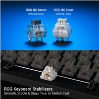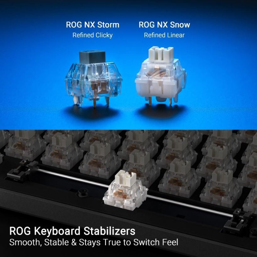 Łączność w trzech trybach: łączność przez Bluetooth (do trzech urządzeń), 2,4 GHz z technologią bezprzewodową ROG SpeedNova (do 1500 godzin pracy na baterii) lub przewodowe przełączniki USB Wymienne w locie: wstępnie nasmarowane przełączniki liniowe NX Snow z konstrukcją ścianki trzpienia, która zwiększa stabilność i zapobiega wnikaniu kurzu.
