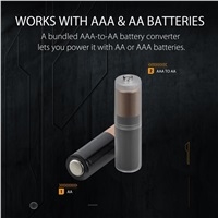 Działa z bateriami AA lub AAA dzięki dołączonemu etui zmniejszającemu wagę o 10%