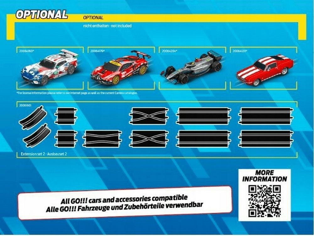 W zestawie: tor, 2 samochody, proste, zakręty, skoczek, część zasilająca, 2x kontroler prędkości, wsporniki, maglownice, instrukcje.