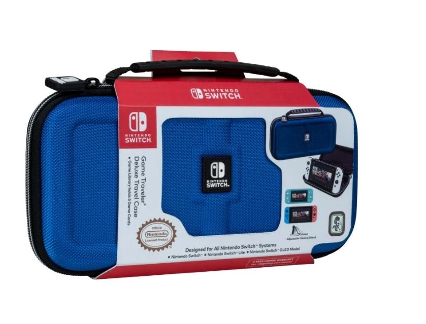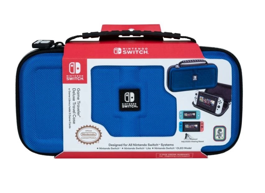 Etui podróżne w luksusowym niebieskim kolorze zapewnia bezpieczeństwo konsoli do gier Nintendo Switch, gdziekolwiek jesteś. Etui posiada regulowaną podstawkę i wysokiej jakości suwak. Oprócz konsoli do gier, w etui można również przechowywać nakładki ochronne Action Grip na kontrolery Joy-Con oraz nakładki ochronne Thumb Grip na drążki analogowe. W zestawie znajdują się dwa plastikowe etui na karty do gier oraz etui na kartę microSD.
