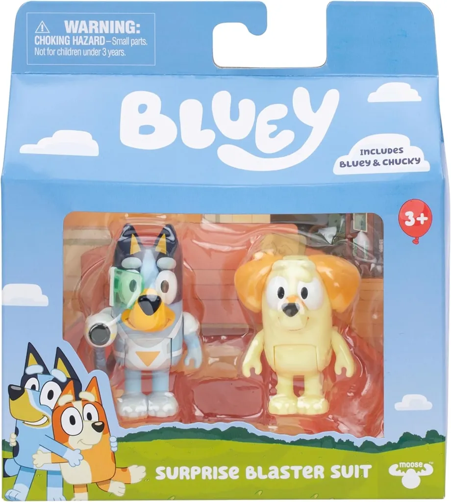- Figurka Bluey jest przebrana w zabawny strój Blaster Suit.