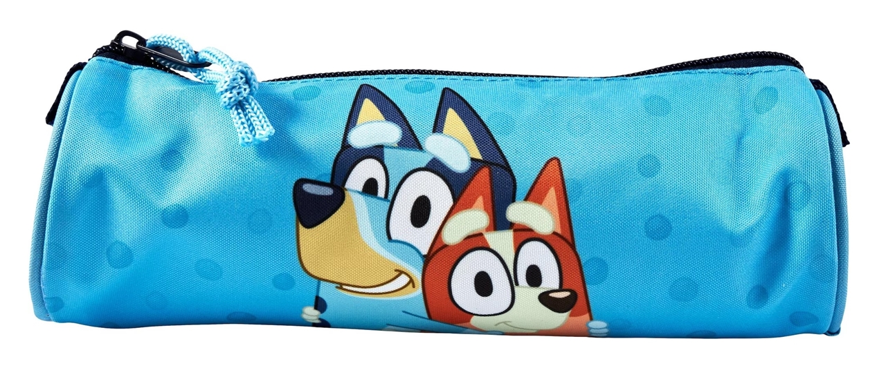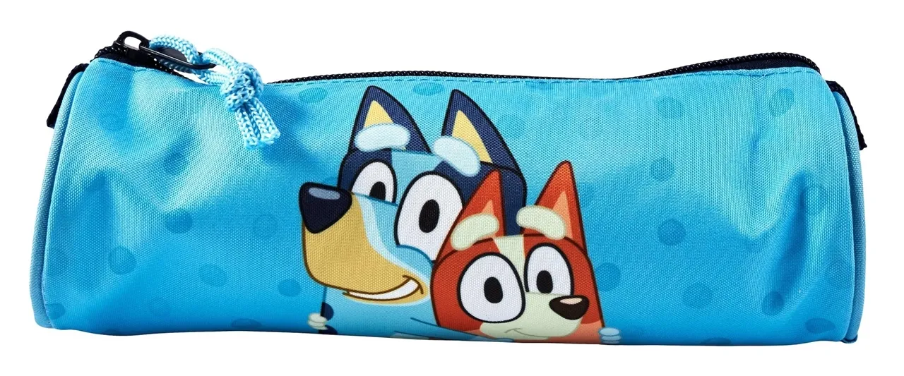 Piórnik na artykuły piśmiennicze wzorowany na serialu dla dzieci Bluey. Piórnik o średnicy 8 cm ma kieszeń zamykaną na zamek błyskawiczny. Przechowuj artykuły piśmiennicze w tym uroczym piórniku z Bluey i Bingo!