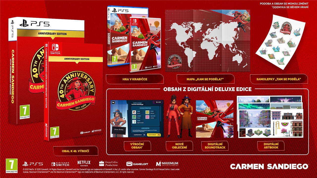 Fizyczna Edycja 40. Rocznicy zawiera dodatkowo mapę „Gdzie ona była?”, naklejki „Gdzie ona jest”, specjalną zawartość cyfrową na 40. rocznicę Carmen Sandiego, klasyczne i motocyklowe stroje dla Carmen, cyfrową ścieżkę dźwiękową i cyfrowy artbook.