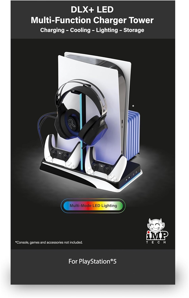 Stylowo zaprezentuj swoją konsolę z wielofunkcyjną stacją DLX+LED na PS5! Będzie doskonale pasować do Twojej konsoli. Dwa wentylatory chłodzące chłodzą Twoją konsolę, aby była gotowa na kolejną rozgrywkę. Podświetlenie LED wzmocni wygląd i wrażenie związane z konsolą i stojakiem, oferując kilka opcji kolorystycznych lub efekt tęczy zmieniającej barwę.