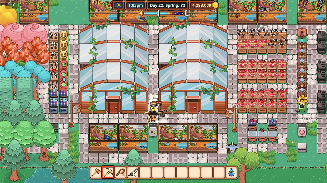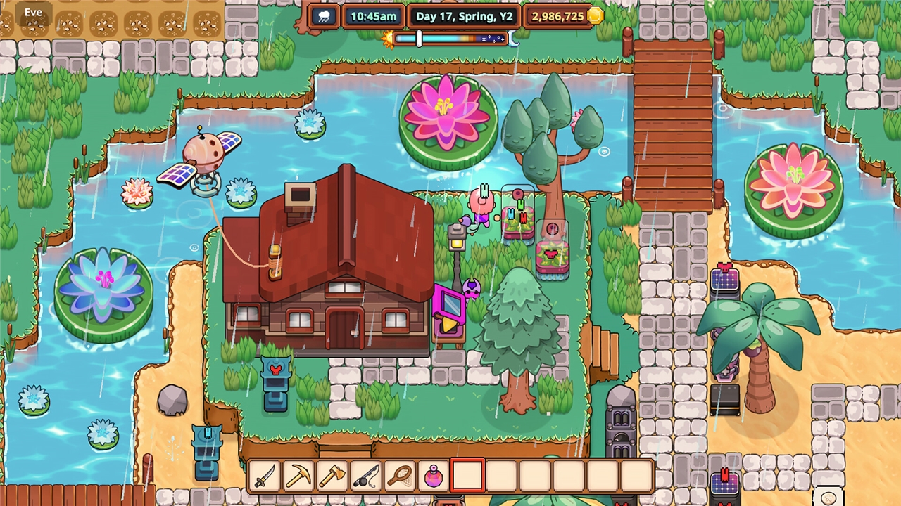 Oczywiście, jeśli potrzebujesz trochę pomocy, nie bój się! Zautomatyzowane drony mogą rozszerzać twój ekwipunek, zajmować się plonami, a nawet pomagać w walce. A twój zwierzak tęsknił za tobą bardziej niż za czymkolwiek, kiedy byłeś pod ziemią. Jest tutaj, aby pomagać ci na farmie i nauczyć się wielu użytecznych rzeczy, takich jak uprawa ziemi, podlewanie plonów, a nawet teleportować cię po mapie. Co? Nigdy nie słyszałeś o teleportującym się kocie?