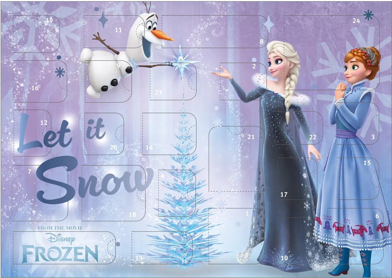 Ciesz się oczekiwaniem na Święta z kalendarzem adwentowym na motywach ulubionych filmów z serii Kraina lodu (Disney: Frozen)! Każdego dnia dzieci mogą otworzyć jedno z 24 okienek, za którym czeka mała niespodzianka inspirowana ulubionymi postaciami z tych magicznych filmów Disneya.