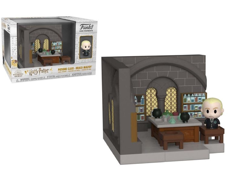 Scena z lekcji eliksirów z Harry'ego Pottera jako diorama Funko POP z Draco Malfoyem. Funko POP to kolekcjonerskie figurki oparte na postaciach z najsłynniejszych filmów, seriali, gier wideo i innych popularnych tematów, które dzięki humorystycznemu potraktowaniu cieszą się sympatią fanów na całym świecie.