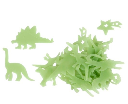 Dinozaury o różnych rozmiarach, które świecą w ciemności po podświetleniu. Można je przykleić na ścianie, suficie lub meblach. Zestaw zawiera 24 elementy.