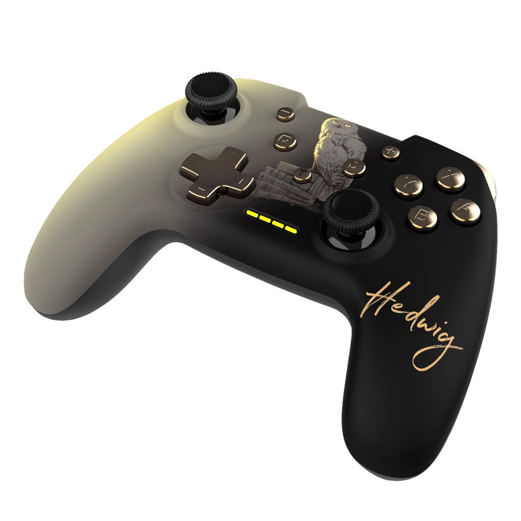 Nintendo Switch Harry Potter - Hedwig Game Controller (Collector's Edition - Black) Ten oficjalnie licencjonowany bezprzewodowy kontroler do gier przedstawiający śnieżną sowę Hedwigę z popularnego świata czarodziejów Harry'ego Pottera jest przeznaczony dla wszystkich posiadaczy konsol Nintendo Switch i Nintendo Switch - OLED Model. Oprócz standardowych funkcji, takich jak dwa górne przyciski, dwa spusty, para silników wibracyjnych i obsługa sterowania ruchem, kontroler oferuje również cztery wskaźniki LED do monitorowania stanu naładowania i postępu wbudowanego akumulatora lub przycisk Turbo ułatwiający wielokrotne naciskanie przycisków i spustów - Bezprzewodowy kontroler gier do konsol Nintendo Switch i Switch - OLED Model - Ergonomiczna konstrukcja zapewnia wygodny chwyt nawet podczas długich sesji grania.