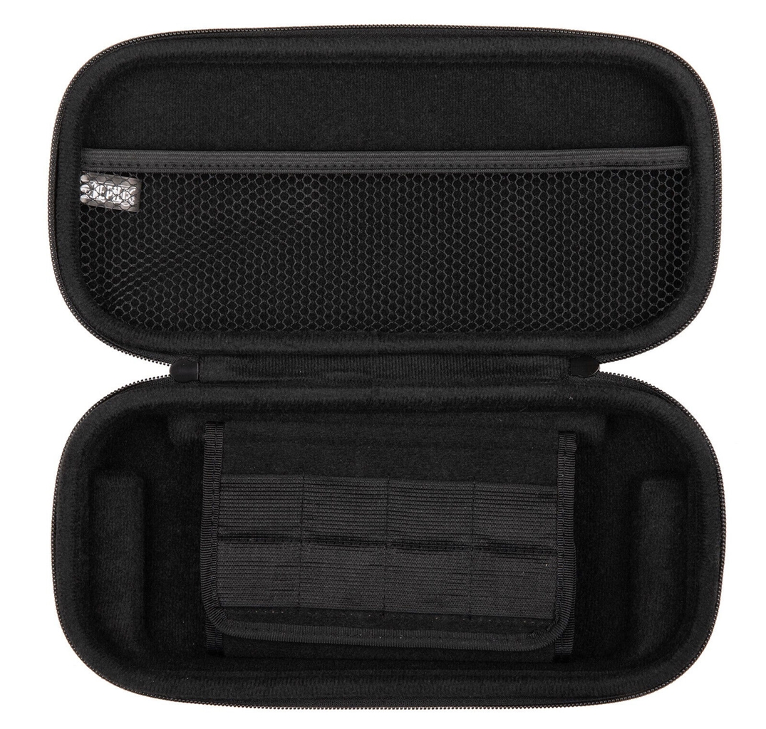 Etui posiada uchwyt ułatwiający przenoszenie oraz zamek błyskawiczny. Wewnątrz znajduje się siatkowa kieszeń do przechowywania dodatkowych akcesoriów, takich jak joy-cony lub kable. Osłona ekranu ma 8 kieszeni do przechowywania kart z grami.