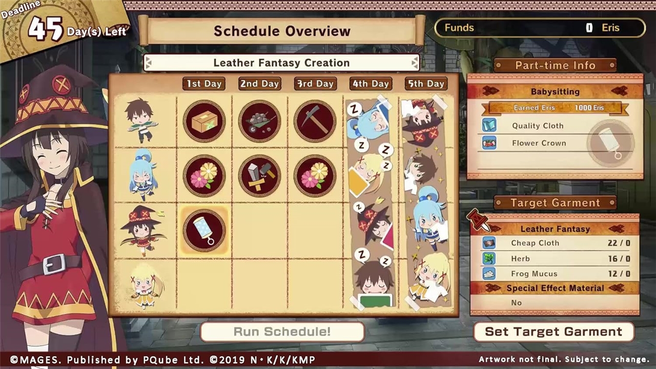 Zarządzanieczasem i zasobami. Wypełnij tygodniowy plan dla każdej postaci w oparciu o jej mocne strony, aby zebrać fundusze i zasoby.