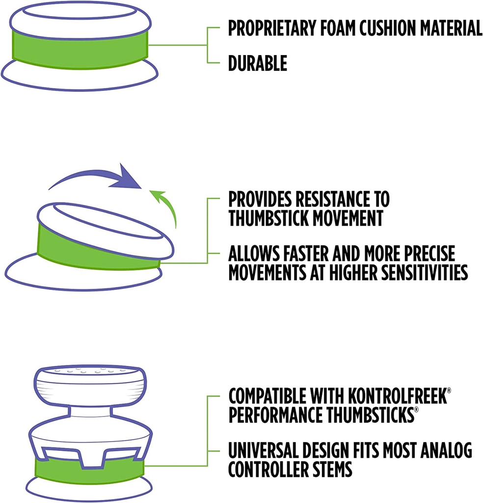 Idealne do gier strzeleckich; pierścienie te tworzą opór podczas poruszania drążkami analogowymi, poprawiając celowanie w przeciwnika. Elastyczny, odprowadzający wilgoć materiał jest odporny na tłuszcz z dłoni i palców, tłumi dźwięk i szybko powraca do swojego pierwotnego kształtu, dzięki czemu można używać pierścieni wielokrotnie.