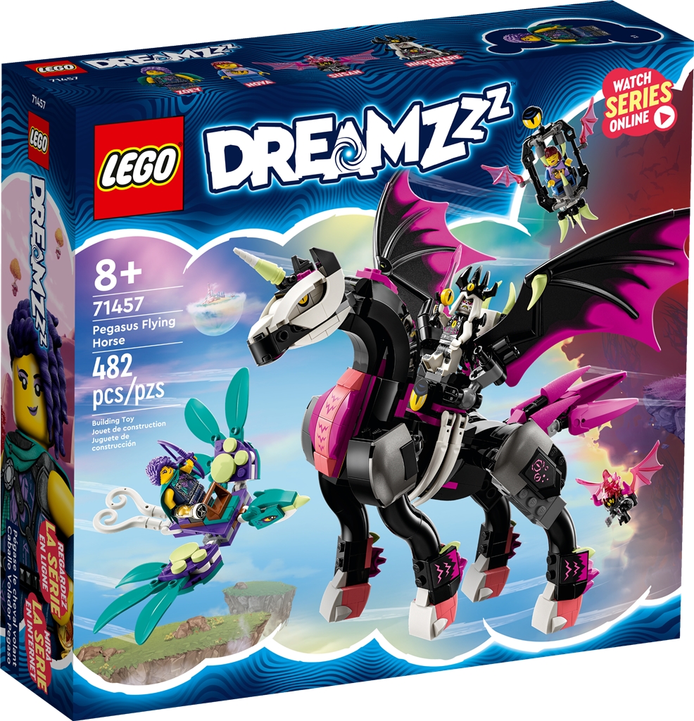 Ten zestaw LEGO® DREAMZzz™ Latający koń Pegaz wciąga dzieci od 8 lat prosto do akcji w Świecie Snów. Podobnie jak w serialu telewizyjnym, tu odbywa się historia Zoey i jej misji ratunkowej dla przyjaciółki Nowy, którą porwała koszmarna Susan na latającym koniu Pegazie. Poradnik budowania prowadzony opowieścią wciąga dzieci do akcji i pobudza ich wyobraźnię przy podejmowaniu decyzji, co Zoey uczyni.