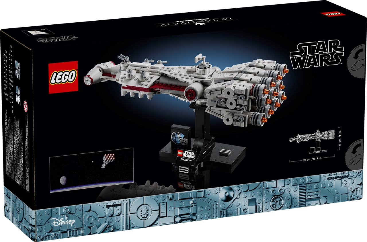 Ten zbudowany model statku kosmicznego z serii LEGO® Gwiezdne Wojny™ ma wymiary: wysokość ponad 15 cm, długość 32 cm i szerokość 11 cm.