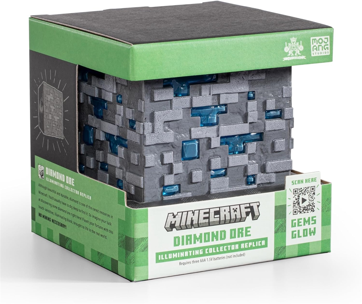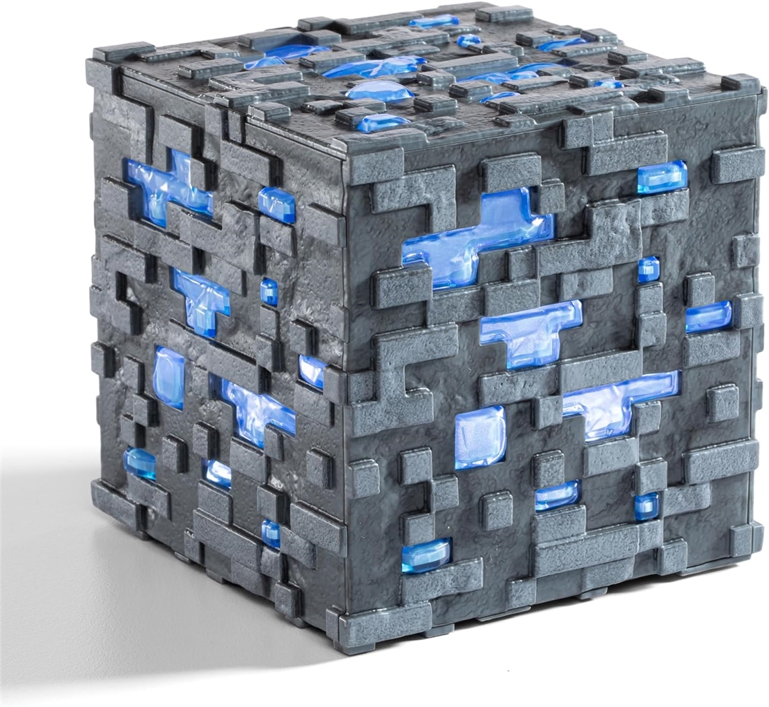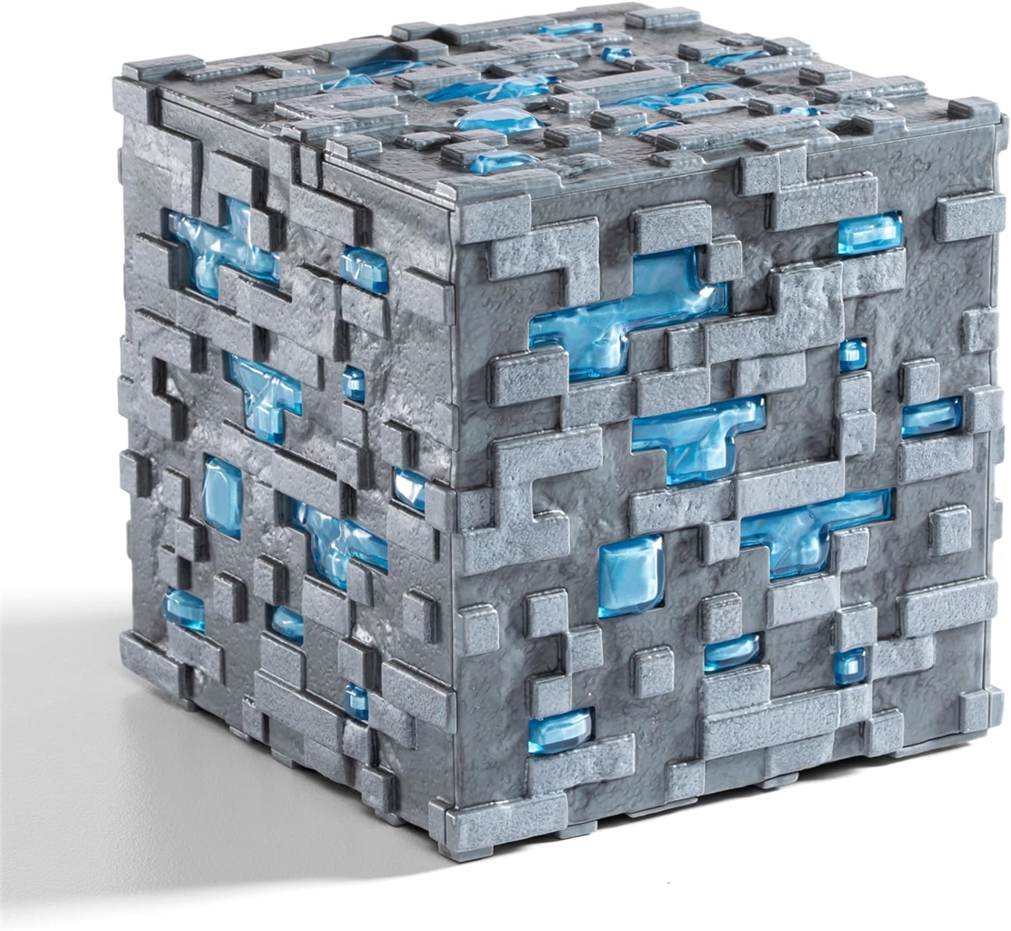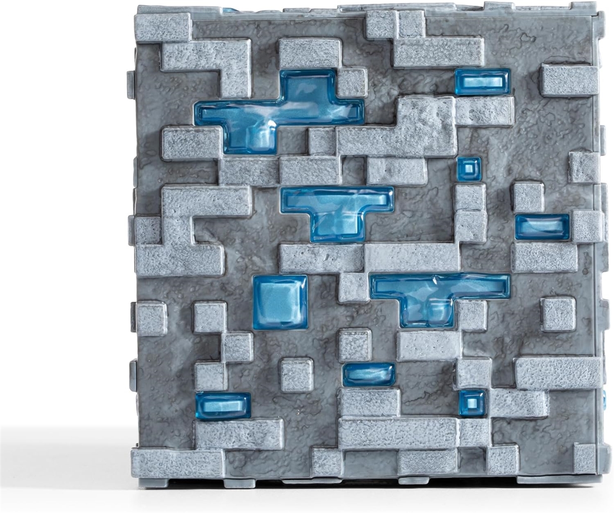 Kolekcjonerska replika diamentowej kostki znanej z gry Minecraft. Szczegóły. Kostka świeci, aby uzyskać efekt świecenia potrzebne są baterie AAA, które nie są dołączone do zestawu. Wymiary: 13,70 cm X 13,70 cm X 13,70 cm. Oficjalna licencja.