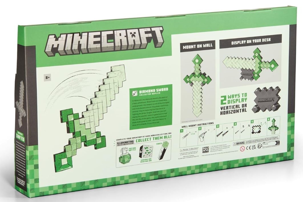 Miecz ma 50 cm długości i 25 cm szerokości. Jest to prawdziwie świąteczny przedmiot, który można dodać do swojej kolekcji. Do miecza dołączona jest podstawka z wytłoczonym logo Minecraft, która może służyć jako uchwyt ścienny lub stołowy.