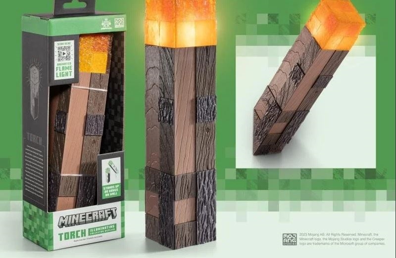 Kolekcjonerska replika latarki znanej z gry Minecraft. Szczegóły. Latarka świeci, do uzyskania efektu świecenia potrzebne są baterie AAA, które nie są dołączone do zestawu. Wymiary: 27,80 cm X 11,00 cm X 7,00 cm. Oficjalna licencja.