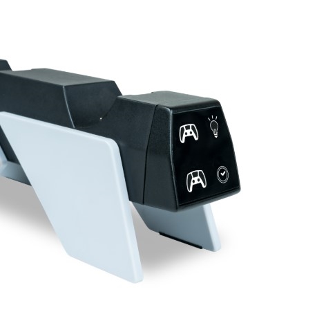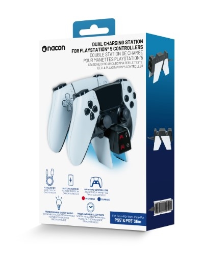 Z tą stacją ładowania firmy Nacon możesz jednocześnie ładować aż dwa bezprzewodowe kontrolery DualSense lub DualSense Edge. Stacja została zaprojektowana z myślą o łatwości użytkowania i jest wyposażona w dwa metalowe złącza, na które wystarczy po prostu nałożyć kontrolery. Oba szybko ładują się w ciągu trzech godzin, a status ładowania można śledzić za pomocą wskaźników LED. Stacja łączy się z konsolą do gier PlayStation 5 za pomocą dołączonego kabla USB i oferuje również kolorowe podświetlenie RGB z możliwością wyboru spośród czterech różnych efektów.