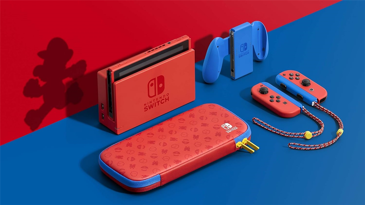 Lewy i prawy kontroler Joy-Con w kolorach Super Mario