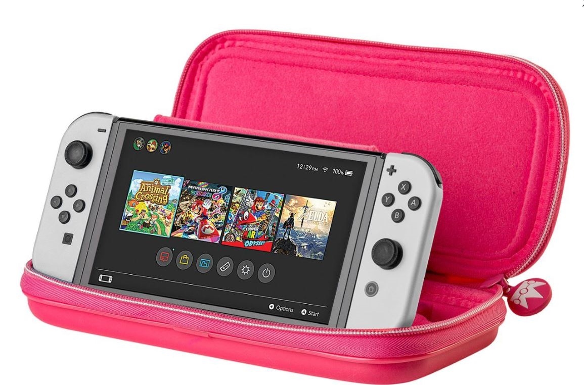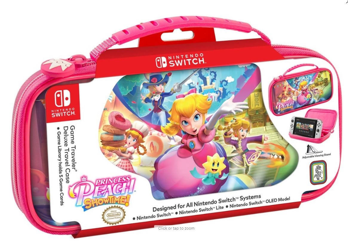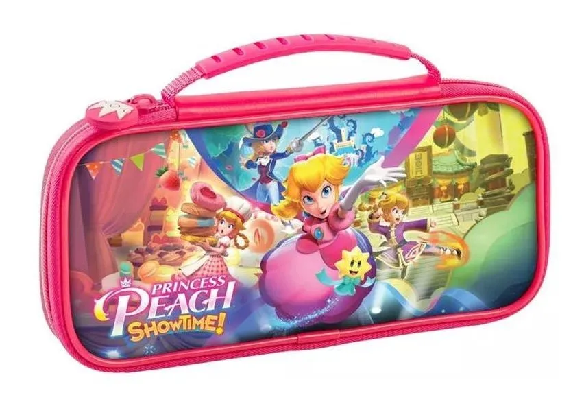 Licencjonowane etui podróżne Nintendo Switch Game Traveler Deluxe do konsoli Nintendo Switch, Nintendo Switch Lite lub Nintendo Switch OLED. Posiada wbudowaną podpórkę ułatwiającą regulację pożądanego kąta widzenia. Etui podróżne Princess Peach Deluxe jest przeznaczone dla wszystkich systemów Nintendo Switch. Zawiera gniazdo kart do gier, które mieści 5 kart do gier, a także etui na kartę Micro SD, które mieści łącznie 2 karty Micro SD.