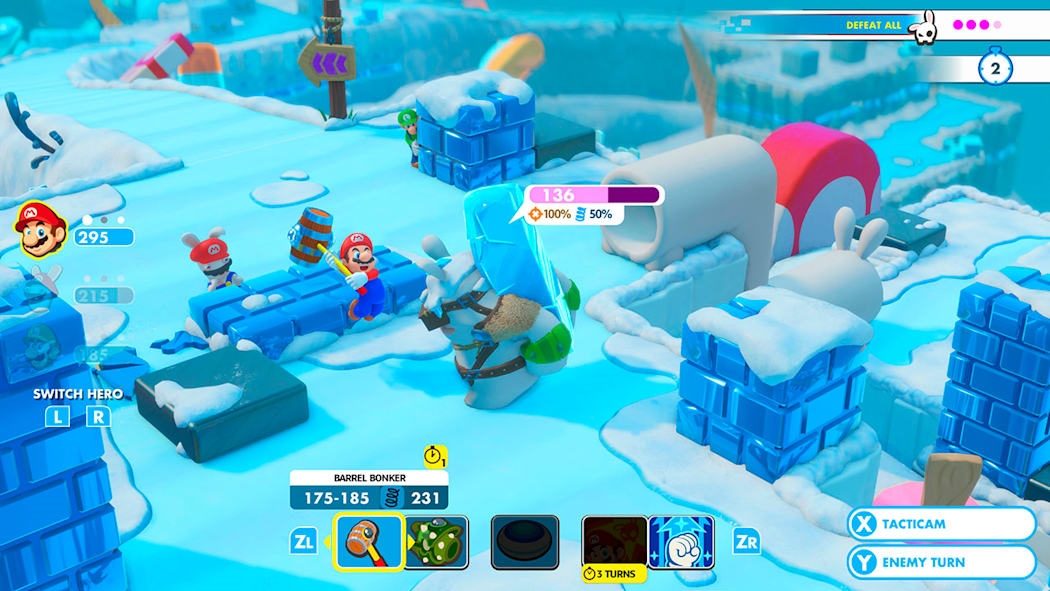 Pamiętasz irytujące uszy Rabbids? Te, które wystają z ziemi i sprawiają, że krew się gotuje, gdy podejrzewasz, że będziesz musiał poradzić sobie z zupełnie nowym zestawem wrogów, jeśli się nie pospieszysz i nie wykonasz zadania? Tak, ty. Donkey Kong udaje się wyrwać je z ziemi i rzucić Rabbidem, który jest ich właścicielem, w innych wrogów.