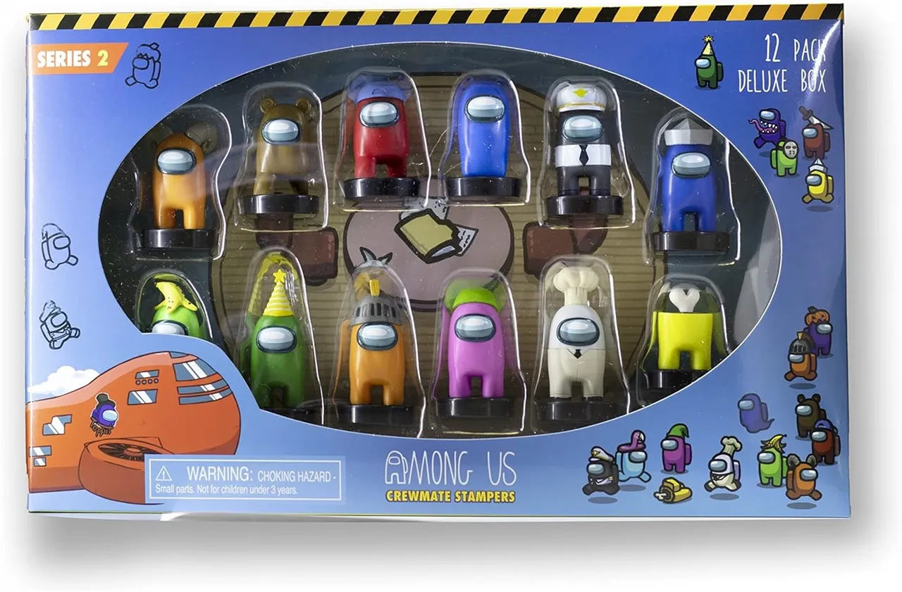 Figurki kolekcjonerskie w formie znaczków przedstawiające postacie "Crewmates" ze znanej gry "Among Us".