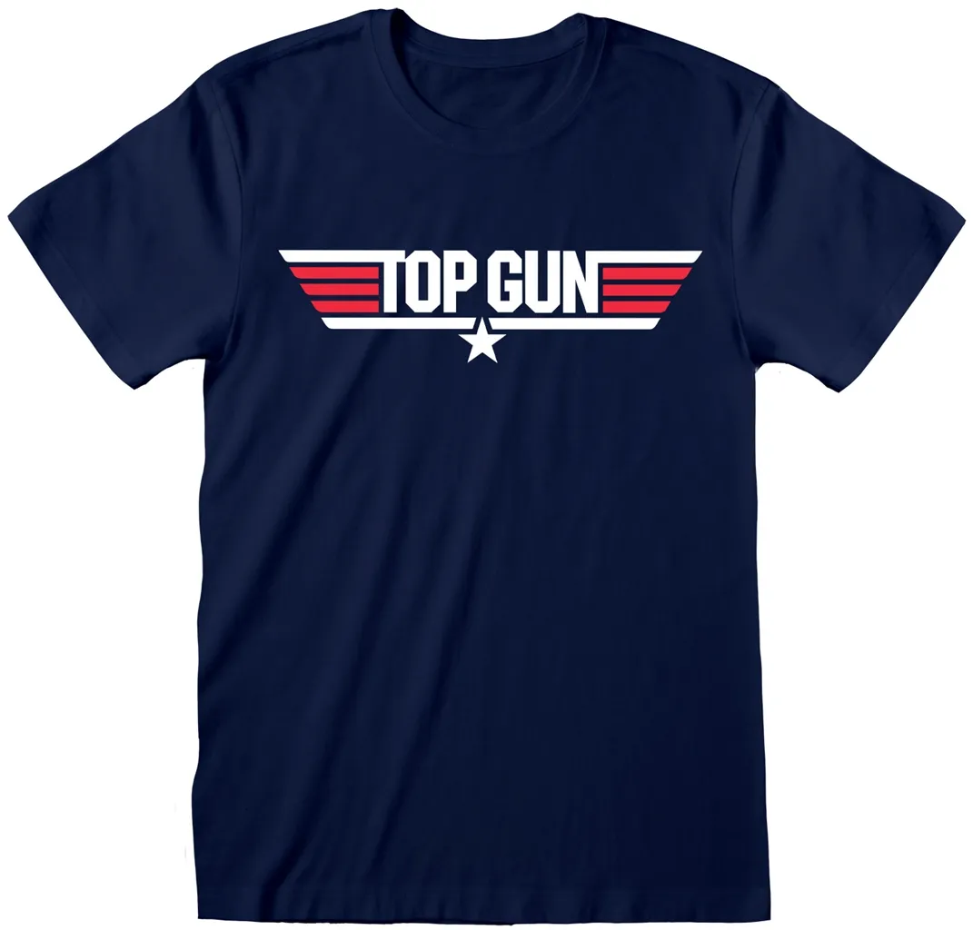Atrakcyjna granatowa koszulka z krótkim rękawem i logo akcyjno-dramatycznego filmu Top Gun. Koszulka nadaje się dla wszystkich fanów, którzy lubią szybkie samoloty.
