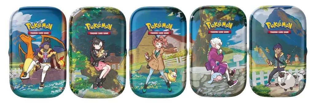 Specjalne opakowanie gry karcianej Pokémon TCG, edycja Crown Zenith - piękne blaszane mini pudełko idealne na prezent dla nowych kolekcjonerów. Leon i Charizard, Marnie i Morpeko, Sonia i Yamper, Bede i Hatenna, Hop i Wooloo.