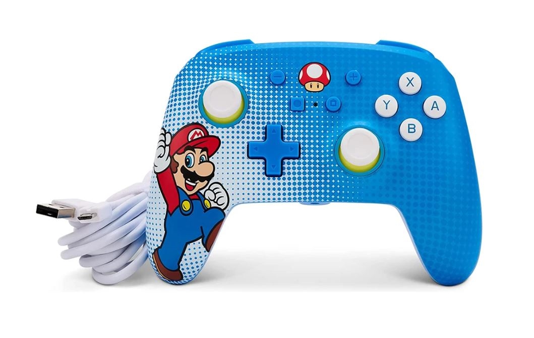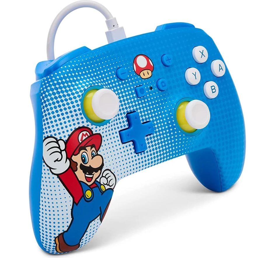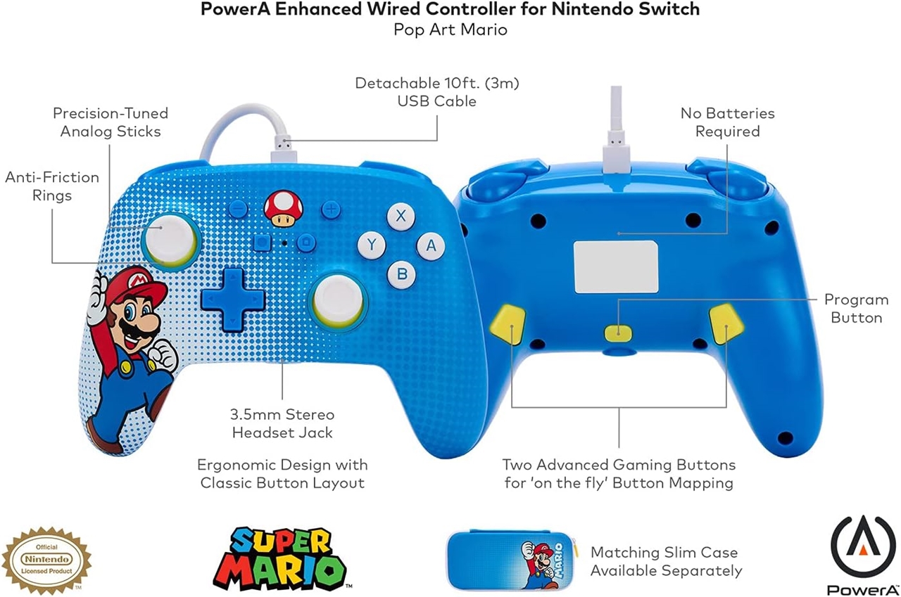 Przewodowy kontroler do gier PowerA do konsoli Nintendo Switch jest wyposażony w gniazdo 3,5 mm do podłączenia zestawu słuchawkowego, 3-metrowy kabel USB, zaawansowane przyciski do gier z możliwością mapowania i standardowy układ przycisków.