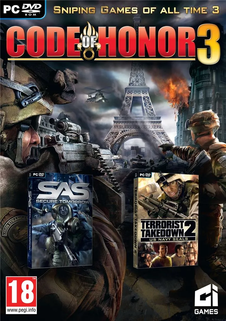 Kolekcja Sniping Games of All Time 3 zawiera Code of Honor 3, SAS: Secure Tomorrow i Terrorist Takedown 2: US Navy Seals .