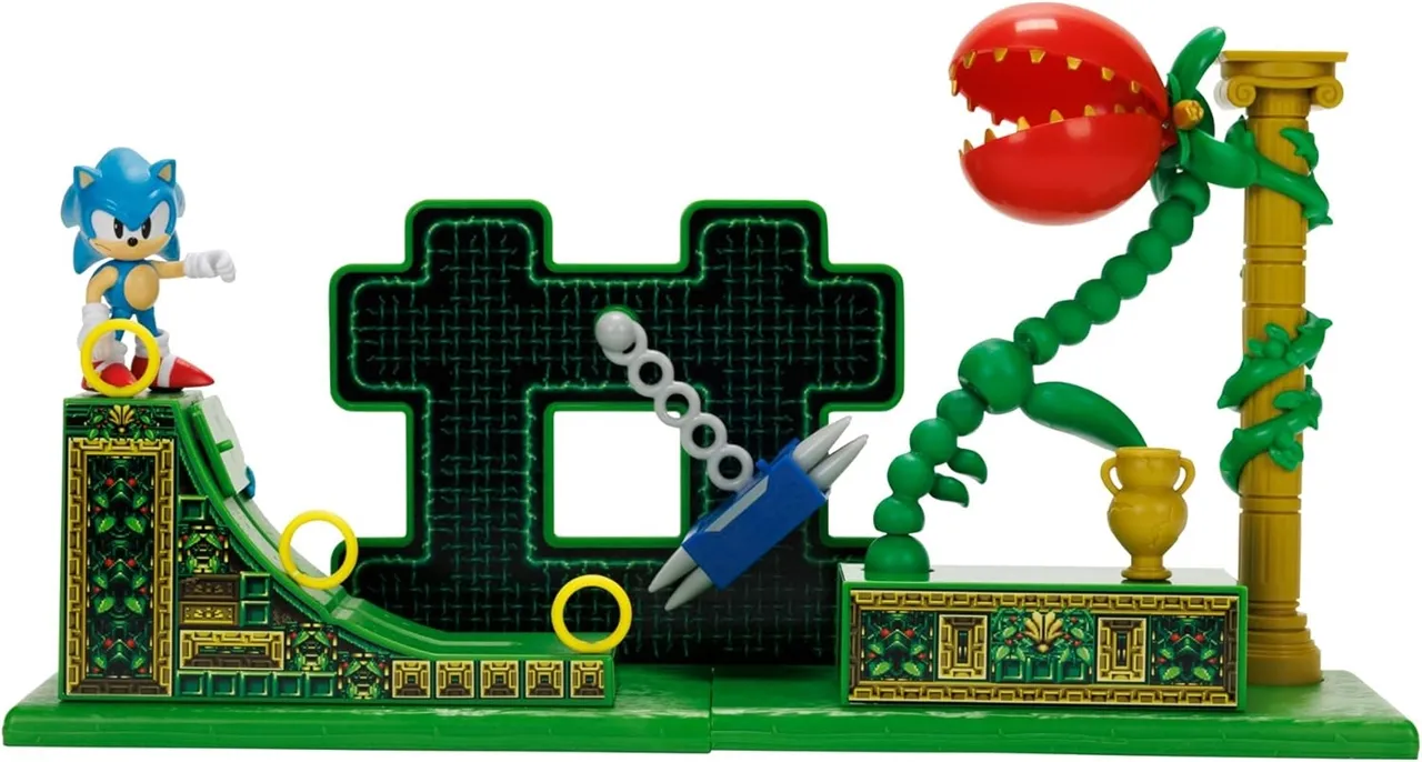 Dzieci mogą tworzyć własne historie w oparciu o ten klasyczny poziom z gier wideo Sonic the Hedgehog! Zestaw zawiera 6,5 cm figurkę Sonica oraz elementy otoczenia z funkcjonalnymi mechanizmami. Zmuś Sonica do szybkiego biegu po zboczu i zbierz wszystkie pierścienie. Skocz na huśtającą się platformę Spike Platform i pokonaj upadek. Uważaj na gryzące łodygi fasoli! Wszystkie figurki to uniwersalne elementy gry, które można dostosować do dłuższej kontynuacji zabawy.