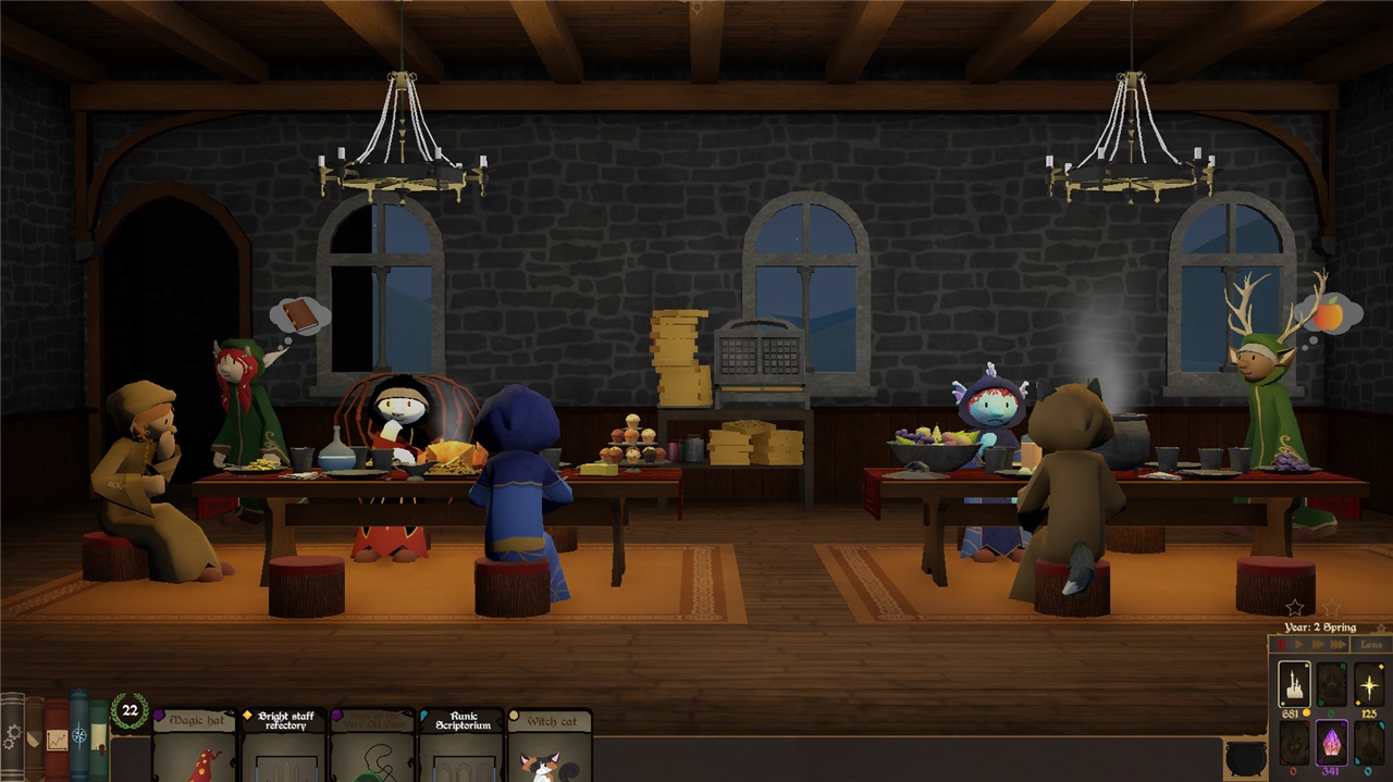 Zarządzaj dobrobytem studentów, budując refektarze, akademiki, pokój wypoczynkowy... lub lochy.