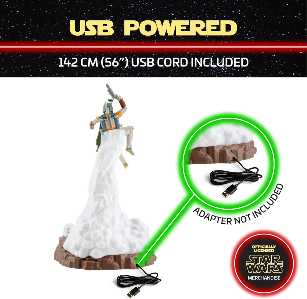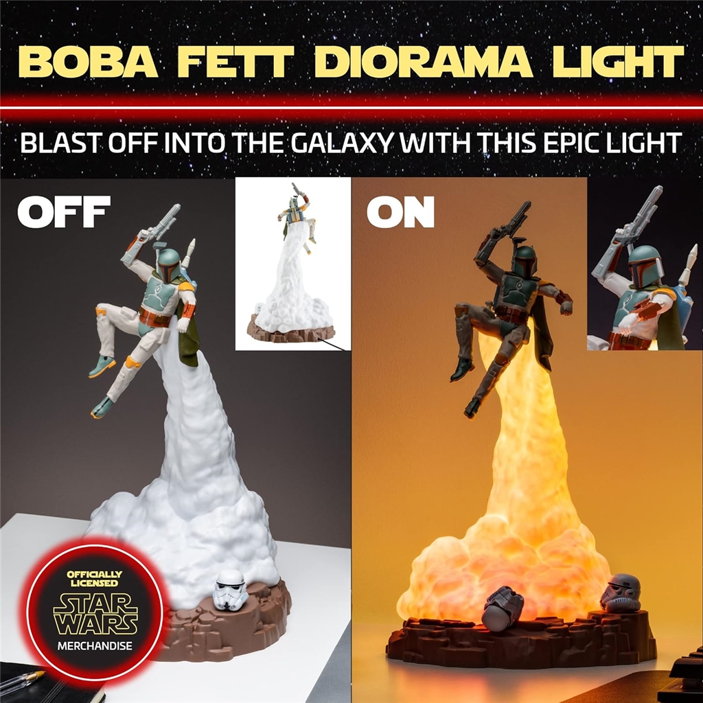 Zapal tę bardzo szczegółową lampę z pięknym modelem 3D Boby Fetta lecącego o zmierzchu. Cały model oferuje wysoki poziom szczegółowości, który jest przyjemnością do odkrycia. Lampa jest zasilana za pomocą kabla USB i ma 3 regulowane poziomy jasności, które można przełączać, obracając hełm szturmowca. Idealny prezent dla każdego fana Gwiezdnych Wojen.
