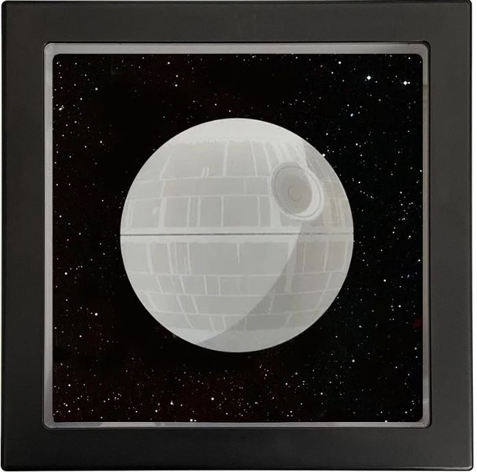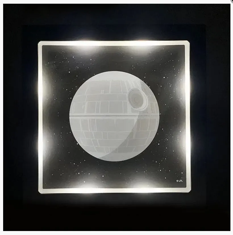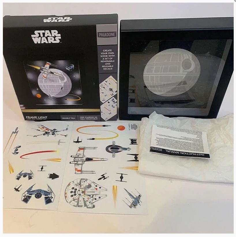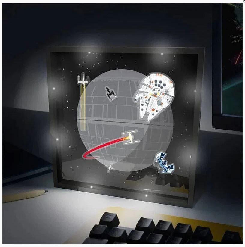 Oryginalną lampę w formie oprawionego obrazu Gwiazdy Śmierci można samodzielnie spersonalizować za pomocą dołączonych naklejek z wizerunkami statków kosmicznych ze świata Gwiezdnych Wojen. Obraz stoi samodzielnie lub można go powiesić na ścianie. Miły prezent i dodatek do domu lub gabinetu. Lampa jest zasilana 3 bateriami AA (brak w zestawie). Wymiary 21 x 21.