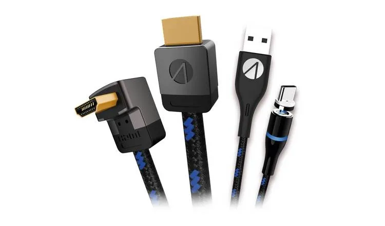Zestaw premium PS5 zawierający kabel HDMI z jedną stroną zagiętą o 90° dla łatwiejszego podłączenia do telewizora. Dodatkowo w pudełku znajdziesz kabel USB C do ładowania kontrolera, który posiada magnetyczną końcówkę dla jeszcze łatwiejszego podłączenia.