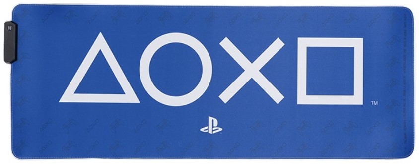 Praktyczna zwijana podkładka gamingowa na biurko z grafiką przycisków PlayStation. Podnieś poziom swojego stanowiska gamingowego dzięki tej podkładce PlayStation. Zewnętrzna strona tej niebieskiej podkładki biurkowej z LED rozświetla się po włączeniu. Wybierz jeden z dwóch trybów kolorystycznych - niebieskie lub białe światło. Jest ozdobiona natychmiast rozpoznawalnymi ikonami kontrolera. Ta podkładka o wymiarach 80 cm (31") x 30 cm (11") jest wystarczająco duża, aby pomieścić pełnowymiarową klawiaturę i mysz, zapewniając większy komfort podczas grania lub pracy.