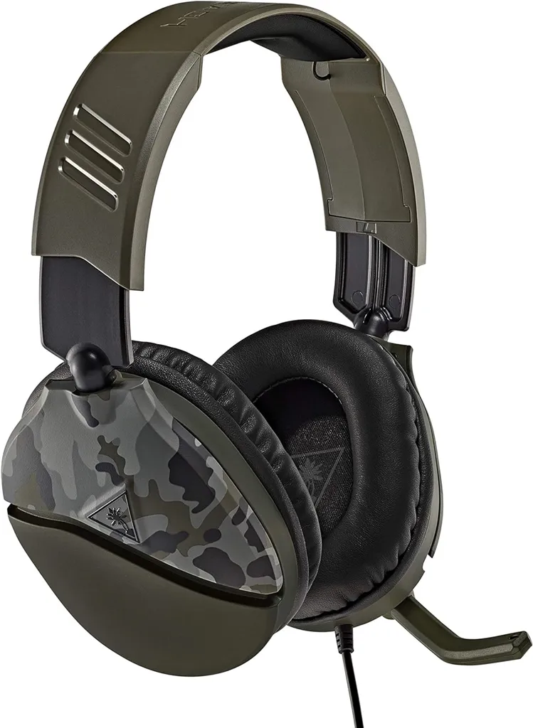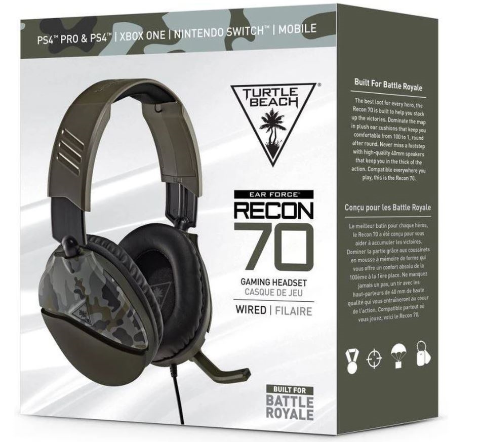 Przewodowy zestaw słuchawkowy do gier Turtle Beach Recon 70, gniazdo 3,5 mm, duże głośniki 40 mm zapewniające doskonały dźwięk, zakres częstotliwości 20 Hz - 20 kHz, regulowany i odłączany mikrofon, elementy sterujące na kablu, uniwersalna kompatybilność.