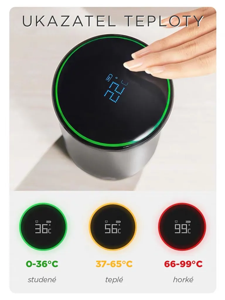 Cooling Cup C2 oferuje wysokiej jakości kolorowy i dotykowy wyświetlacz LCD, który w każdej chwili pokaże Ci temperaturę płynu w butelce. Oprócz temperatury znajduje się kolorowy pasek obwodowy dla szybkiego podglądu temperatury. Zielony dla temperatury do 36oC, pomarańczowy od 37oC do 65oC i czerwony dla temperatury powyżej 66oC.