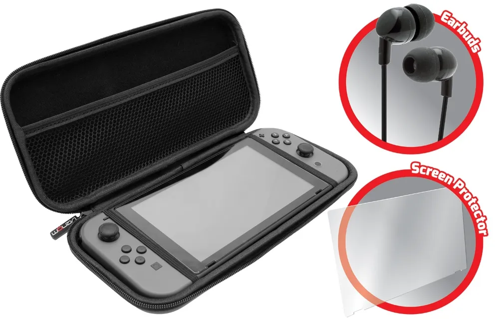Idealny zestaw do grania z Nintendo Switch w podróży. Chroń swoją konsolę wytrzymałym etui, zapobiegaj zarysowaniom dzięki szkłu hartowanemu, a gry przechowuj bezpiecznie w wewnętrznej kieszeni. W pakiecie znajduje się także zestaw słuchawkowy do niezakłóconej gry w podróży.