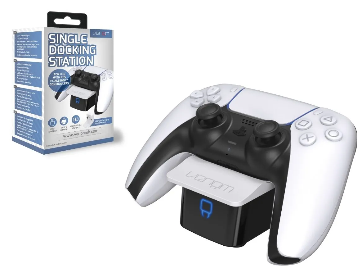Estetycznie zaprojektowana, pasująca do konsoli PS5 i kontrolera DUALSENSE™, stylowa stacja dokująca z funkcją upuszczania i ładowania oferuje szybkie i wydajne ładowanie kontrolera PS5.