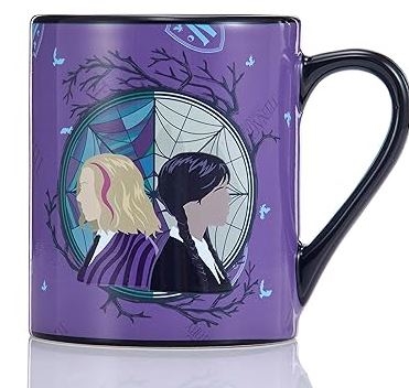 Kubek oficjalny Wednesday i Enid zmieniający się pod wpływem ciepła ujawnia okno pokoju w Nevermore. Oficjalny kubek dla fanów serialu Wednesday na Netflixie.