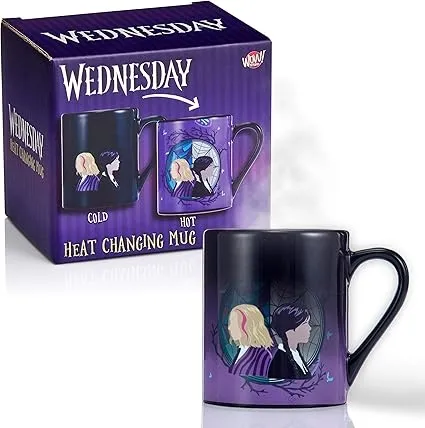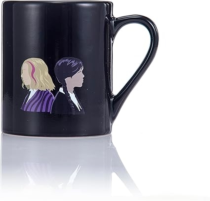 Kubek z motywem Wednesday: Wlej gorący napój, kawę, herbatę lub gorącą czekoladę i zobacz, jak ten oficjalny kubek Wednesday Addams zmienia kolor, ukazując szkołę Nevermore Academy z ulubionego serialu Wednesday na Netflixie.