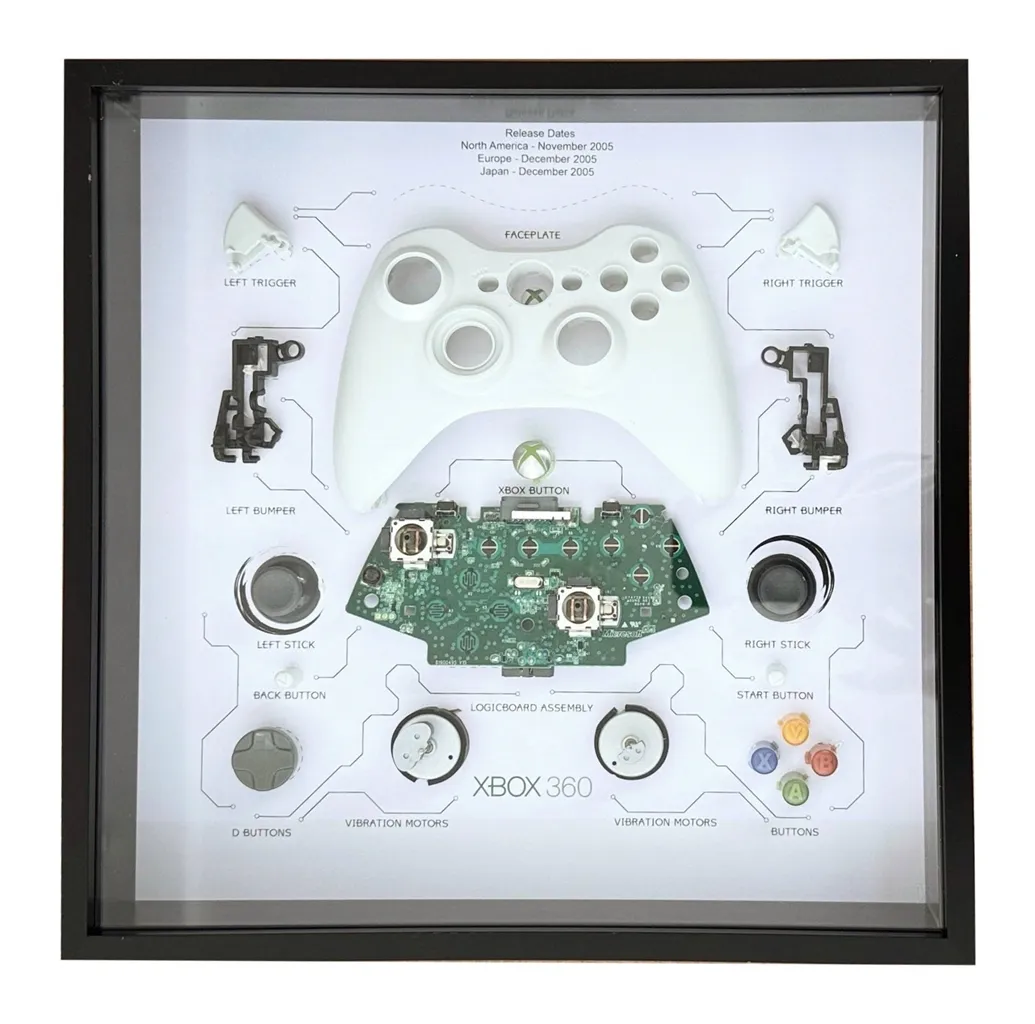 Oryginalna dekoracja do pokoju każdego gracza, który lubi gaming! Obejrzyj każdy komponent, który znajduje się wewnątrz kontrolera do Xbox 360 na tym shadowboxie, który z pewnością przyciągnie uwagę.