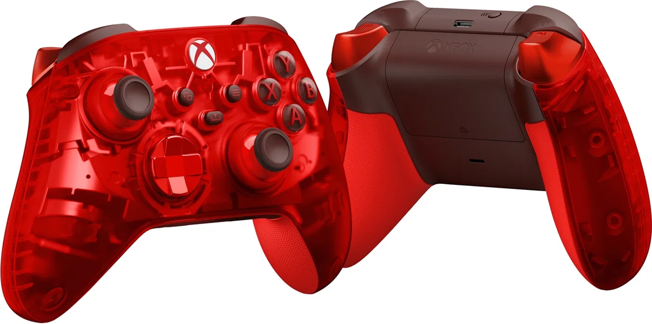 Odkryj tajemnice bezprzewodowego kontrolera dla Xbox - Pulse Cipher Special Edition z przezroczystym czerwonym designem, srebrnym wnętrzem i metalowymi elementami. Spojrzyj przez czerwone przezroczyste górne obudowy i boczne osłony, aby zobaczyć metalowe, srebrne wewnętrzne części, które prześwitują od środka.